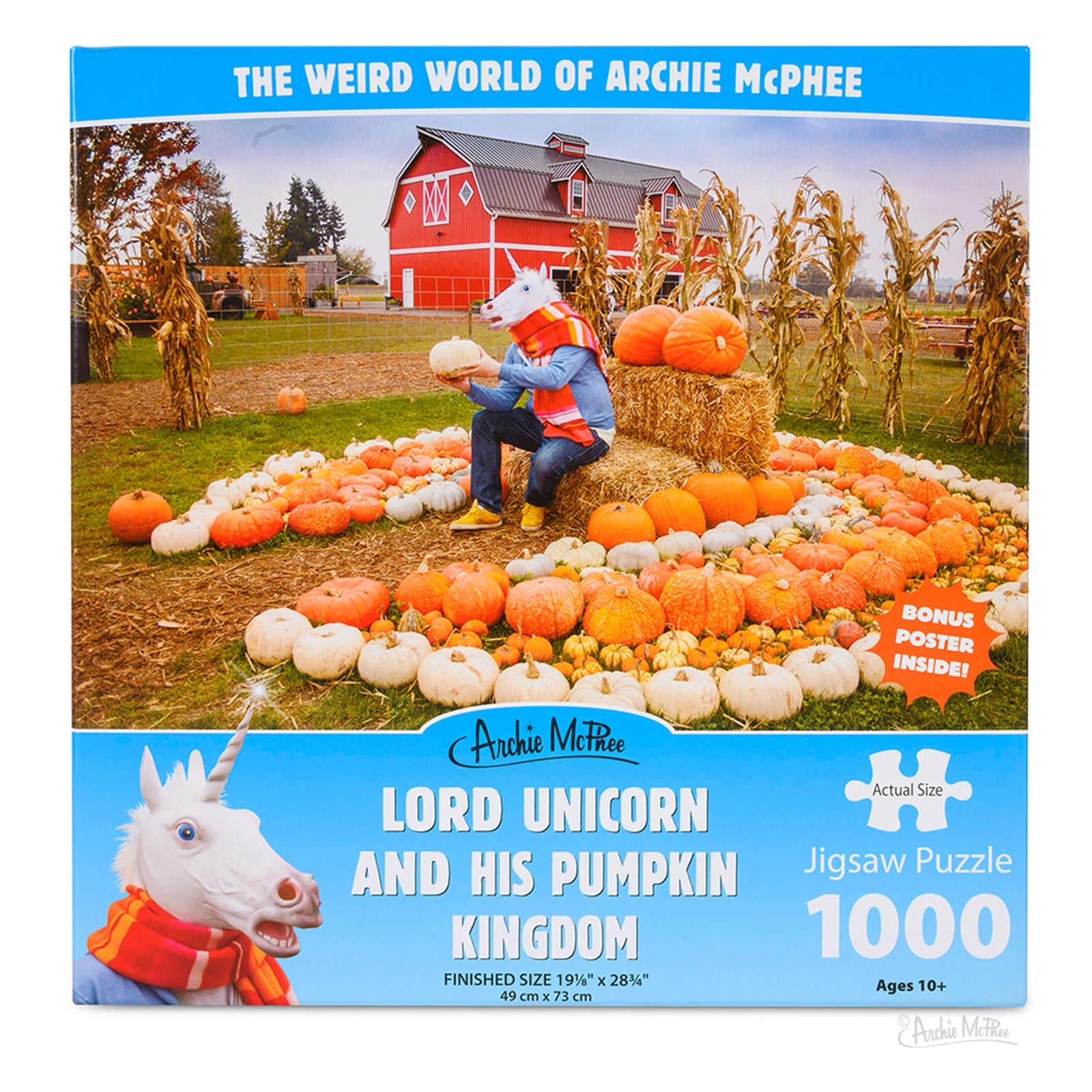This is a Lord Unicorn And His Pumpkin Kingdom 1000 Piece Puzzle that's produced by Archie McPhee.